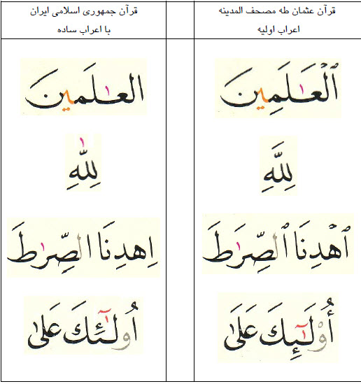 نتيجه اين روش تهيه ي قرآني به خط عثمان طه اما با اعراب گذاري ساده تر بود. نمونه اي از اعراب كلمات در اين دو قرآن در جدول زير آمده است .